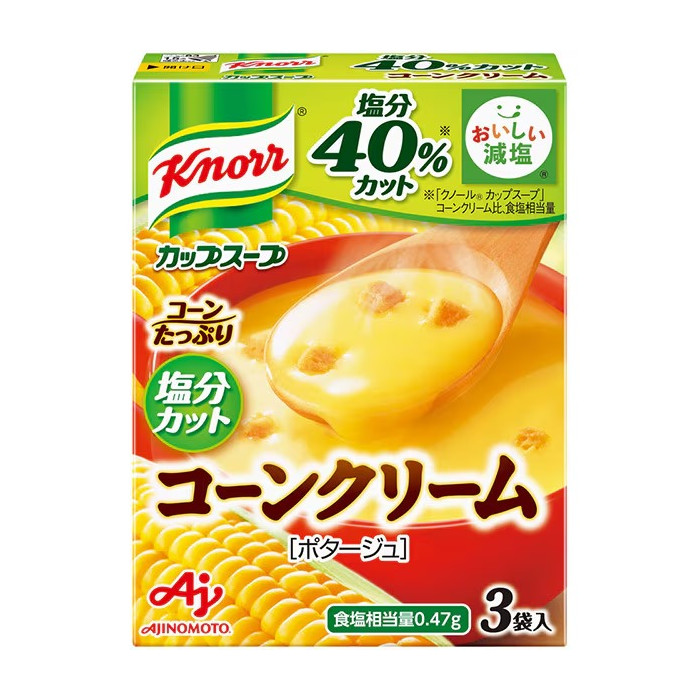 * 제품 패키지 및 구성은 예고 없이 변경될 수 있습니다.상품명 크노르 옥수수크림 염분컷 스프 3봉입 (영문명: Knorr Corn Cream Low Salt Soup) 메이커 / 브랜드 아지노모토 / 크노르 규격 / 구성 / 중량 총 56.7g (18.9g × 3봉) ※ 상품리뉴얼로 패키지나 구성·내용량이 변경될 수 있습니다. 포장 무게 (추정) 약 73g 효능 / 기능 일반 옥수수크림 스프 대비 염분을 약 40% 줄여 부담을 낮춘 저염 제품이며, 슈퍼스위트 옥수수를 풍부히 사용하여 단맛과 식감을 살렸습니다.