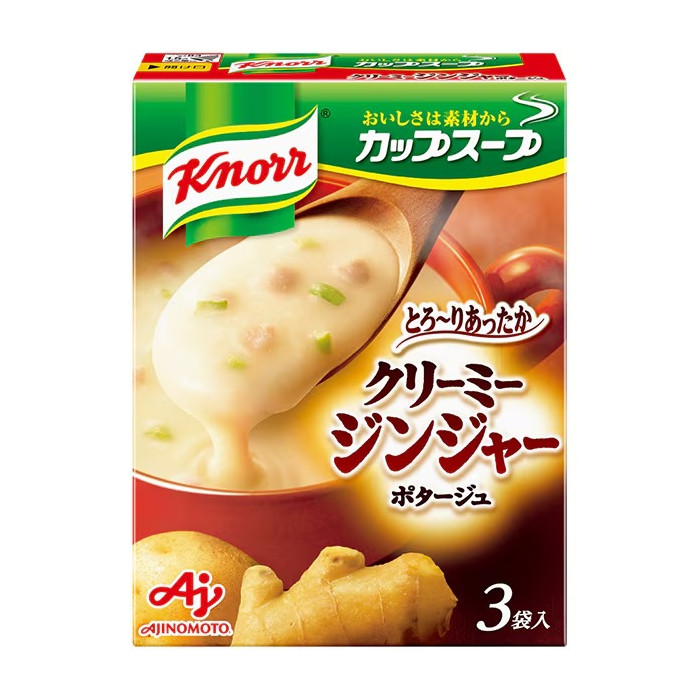 * 제품 구성이나 패키지는 예고 없이 변경될 수 있습니다.상품명 크노르 크리미 생강 포타주 3봉입 (영문명: Knorr Creamy Ginger Potage) 메이커 / 브랜드 아지노모토 / 크노르 규격 / 구성 / 중량 3봉 구성, 각 봉지 분말 스프