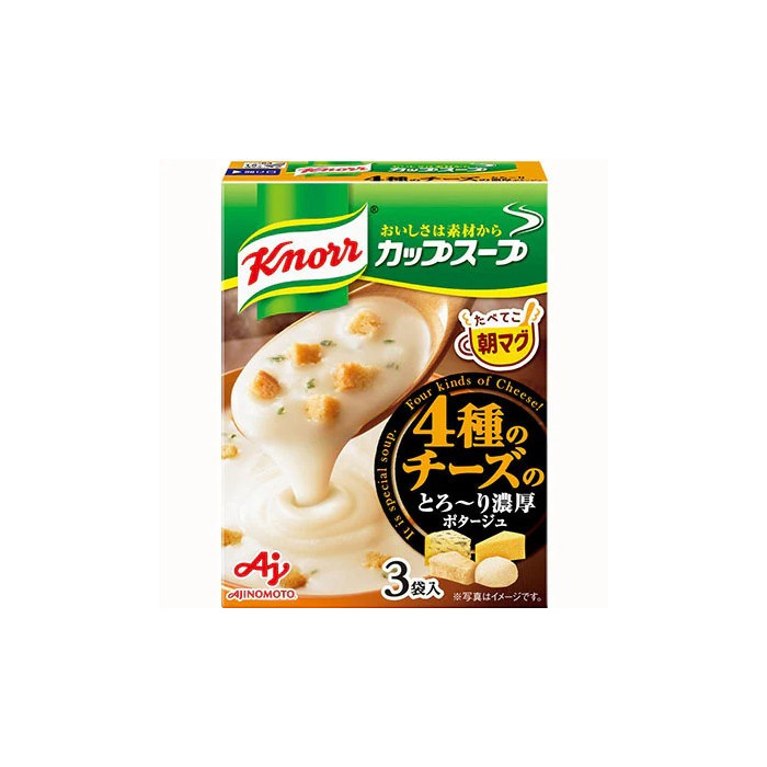* 제품 패키지 및 구성은 예고 없이 변경될 수 있습니다.상품명 크노르 컵스프 4종 치즈 55.2g (영문명: Knorr Cup Soup 4 Cheese Potage) 메이커 / 브랜드 아지노모토 / 크노르 규격 / 구성 / 중량 총 55.2g (18.4g × 3봉) ※ 상품리뉴얼로 상품패키지 및 내용량이 변경될 수 있습니다. 포장 무게 (추정) 약 78g 효능 / 기능 모짜렐라, 체다, 파르메산, 블루치즈 등 네 가지 고급 치즈가 조화롭게 어우러져