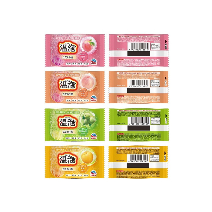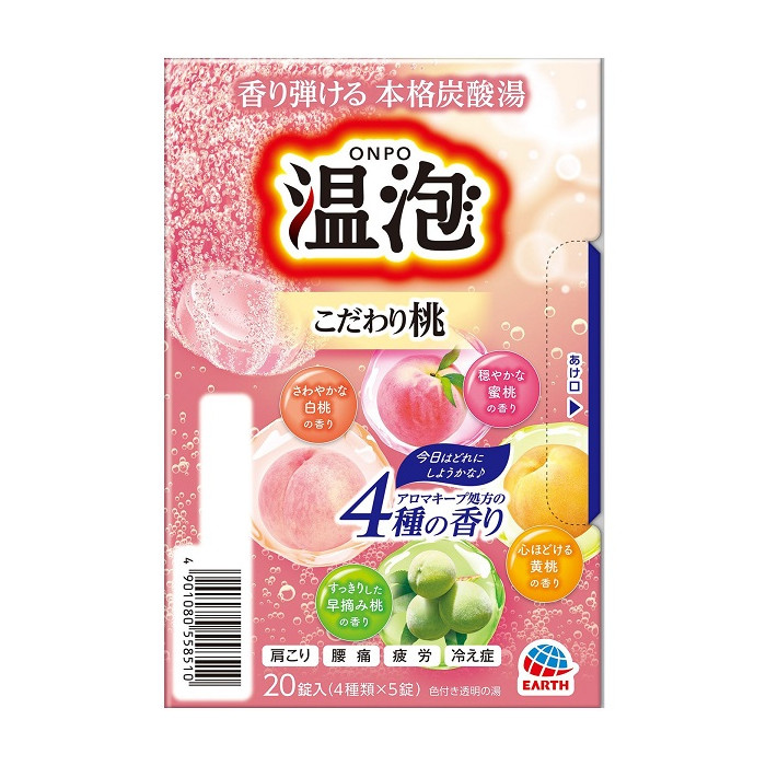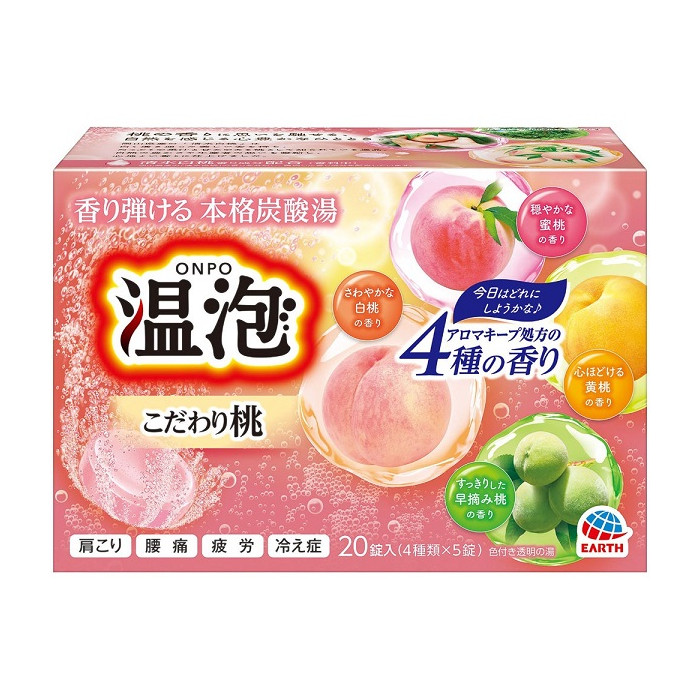온포 고급 복숭아향 탄산 입욕제 20정입 (Earth Onpo Peach Carbonated Bath Tablets)온포, 복숭아향입욕제, 탄산입욕제, 피로회복, 일본입욕제, 냉증완화, 발포입욕제, 아스제약상품 정보 일본 아스제약의 프리미엄 탄산 입욕제 ‘온포 고급 복숭아향 탄산탕’은 4가지 복숭아의 향기를 담은 20정 구성 제품입니다. 온천 성분과 미세한 탄산의 거품이 피부에 닿아 피로를 효과적으로 풀어주며, 기분까지 상쾌하게 전환시켜줍니다. 하루의 피로를 따뜻한 복숭아 향과 함께 풀어보세요. 메이커/브랜드 아스제약 (Earth Corporation) 내용량 20정입 (4종류 × 각 5정)