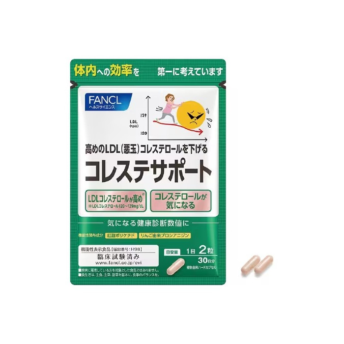상품 정보 판클(FANCL)의 콜레스테 서포트 60정입은 고(高) LDL(나쁜)콜레스테롤이 걱정되는 분들을 위해 개발된 기능성 표시 식품입니다. 식사나 운동과 함께 콜레스테롤 관리를 체계적으로 지원하며, 1일 2정 복용만으로도 식물 유래 ‘홍국폴리케치드’ 및 ‘사과유래 프로시아니딘’이라는 두 가지 기능성 성분이 체내 콜레스테롤 생성 억제 및 배출을 도와주는 복합 접근을 제공합니다. 브랜드 판클 (FANCL) 내용량 60정 (30일 분량 기준) ※ 1일 2정 복용 형태 정제 캡슐형 건강보조식품 비고 ※ 상품리뉴얼로 상품패키지 및 내용량이 변경될 수 있습니다. 효능 이 제품은 기능성 표시 식품으로 ‘홍국폴리케치드’ 및 ‘사과유래 프로시아니딘’이 포함되어 있어,