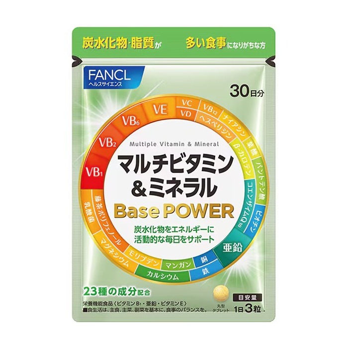 상품 정보 판클(FANCL)의 멀티비타민&미네랄 Base POWER 90정입(30일분 기준: 하루 3정 복용) 제품입니다. 현대인의 식사 패턴과 생활 리듬을 고려해, 비타민·미네랄·식물성 유산균 등 **총 23종의 성분**을 하루 3정에 응축하여 설계되었습니다.