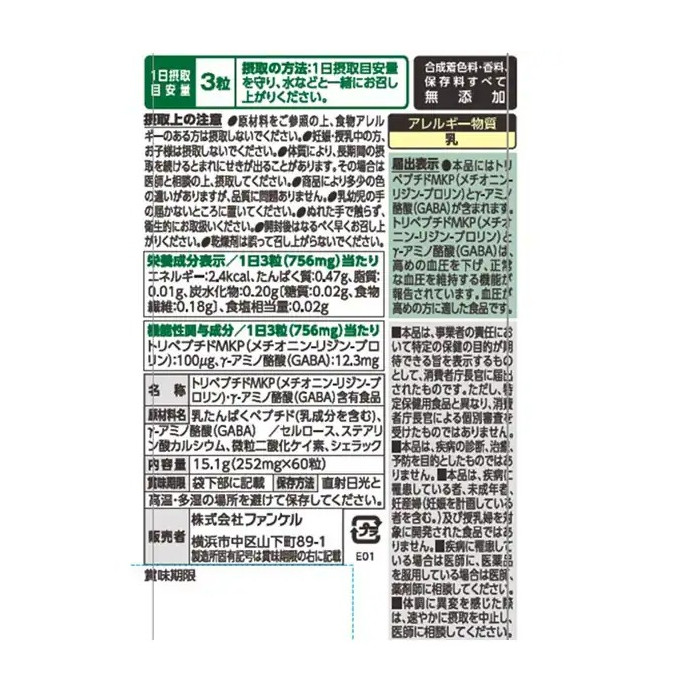 브랜드 판클 (FANCL) 내용량 60정 (20일분 기준) 형태 정제형 건강보조식품 비고 ※ 상품리뉴얼로 상품패키지 및 내용량이 변경될 수 있습니다. 효능 본 제품은 기능성 표시식품으로, 트리펩타이드 MKP 및 GABA를 복합 배합하여 "혈압이 약간 높은 성인"의 혈압을 낮추고 정상 혈압 유지에 도움이 되는 기능이 보고되어 있습니다. 용법/용량 1일 3정을 물과 함께 섭취하십시오.