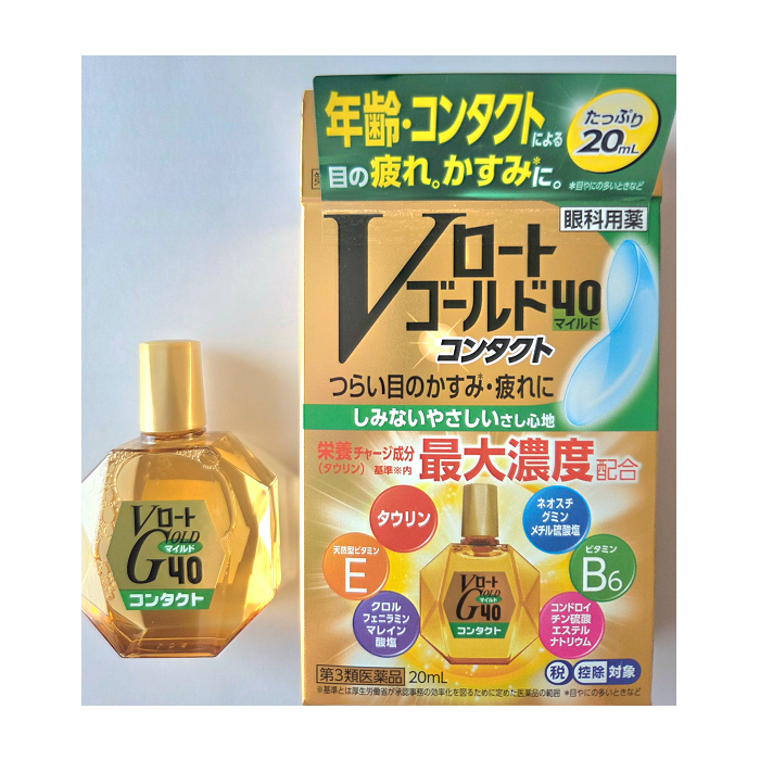 상품 정보 V Rohto Gold 40 Contact — 콘택트렌즈(소프트/하드) 착용 중에도 사용할 수 있는 일본제 안약입니다. 눈의 흐림이나 피로, 충혈, 가려움, 자극감 등으로 인한 불쾌함을 완화하며, 점안 후 시원하고 깔끔한 느낌을 줍니다. 20 mL 용량으로 휴대와 사용이 간편합니다. 효능 / 효과 • 눈의 흐림 (예: 눈곱이 많을 때)