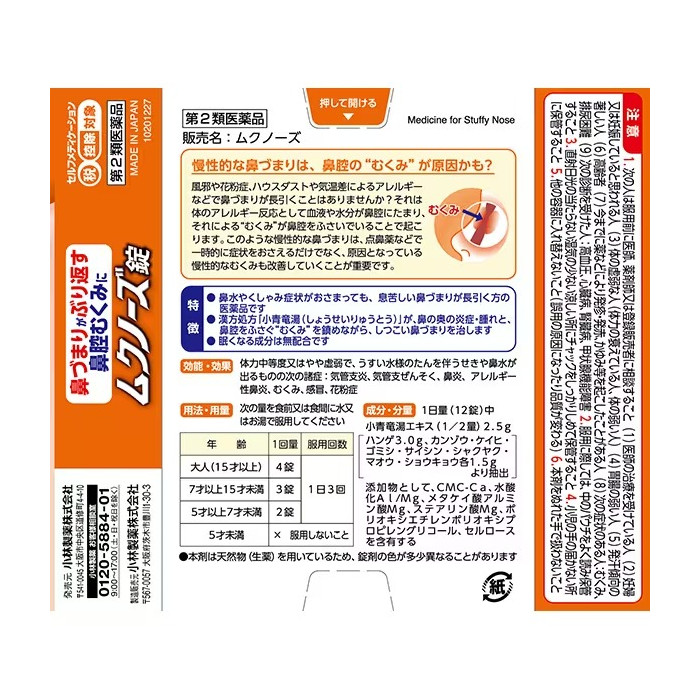 상품 정보 고바야시 무크노즈 코감기·비염 개선제 36정는 일본 고바야시 제약이 제조한 제2류 의약품으로, 전통 한방 처방인 소청룡탕을 활용해 코 안쪽의 염증과 붓기를 완화하고 코막힘 증상을 개선하는 약입니다. 감기, 알레르기 비염 등으로 코막힘이 이어져 숨쉬기 어려울 때 도움을 줍니다. 특히 코막힘을 일시적으로 억제하는 데 그치지 않고, 코 안쪽 붓기를 가라앉혀 통로를 넓힙니다. 또한 졸음 유발 성분이 들지 않아 일상 생활 중에도 복용 가능합니다. 효능 • 감기나 알레르기성 비염으로 인한 코막힘, 콧물, 재채기 증상 개선