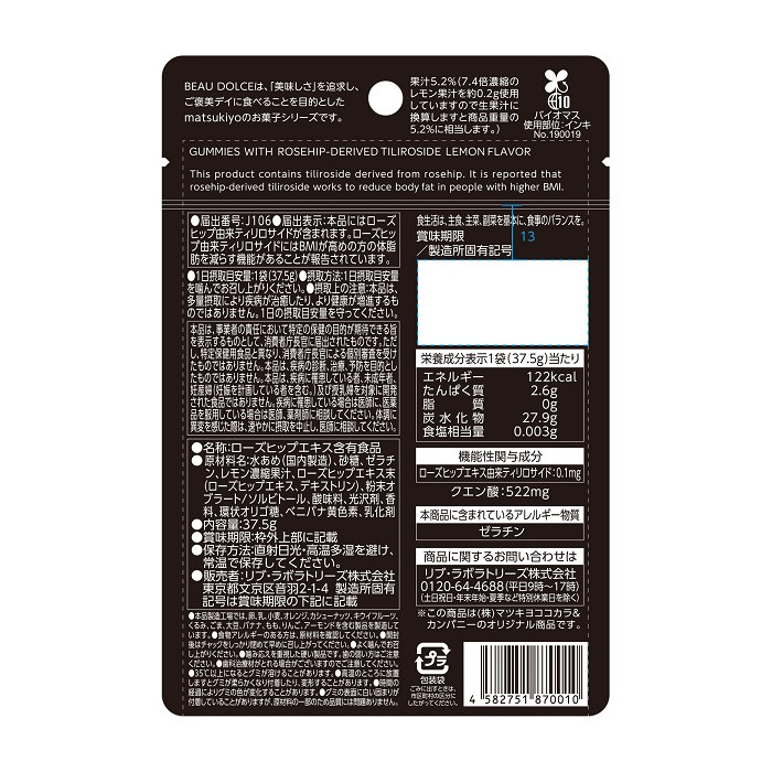 • 어린이, 임산부, 질환이 있는 분은 전문가와 상담 후 섭취하세요.마츠키요 BEAU DOLCE 구미, 로즈힙 구미, 티리로사이드 기능성, 일본 레몬 구미, 체지방 감소 보조, 일본 기능성 그미, 건강 간식 일본상품 정보 고시