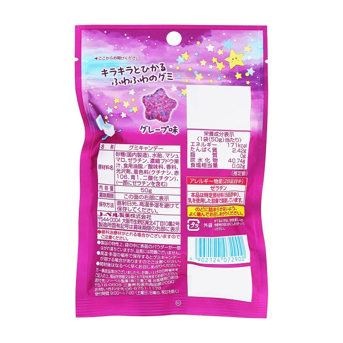 상품 정보 일본에서 사랑받는 과자 브랜드 노벨의 인기 포켓 구미, **Nobel Kirafuwa Gummy Grape 50g**입니다. 별 모양의 귀여운 구미는 부드러운 속과 반짝이는 설탕 코팅이 어우러져 “ふわシャリ” 특유의 포근하면서도 살짝 바삭한 식감을 제공합니다. 상큼한 포도(그레이프) 맛으로 남녀노소 누구나 즐길 수 있는 스낵입니다. 효능 이 제품은 즐거운 간식용 과자로서, 식사 후 달콤한 후식이나 간단한 간식, 간단한 에너지 보충용으로 적합합니다. 별 모양의 귀여운 디자인과 부드러운 식감으로 파티나 간식용으로도 인기입니다. 용법/용량 1) 봉지를 개봉합니다.