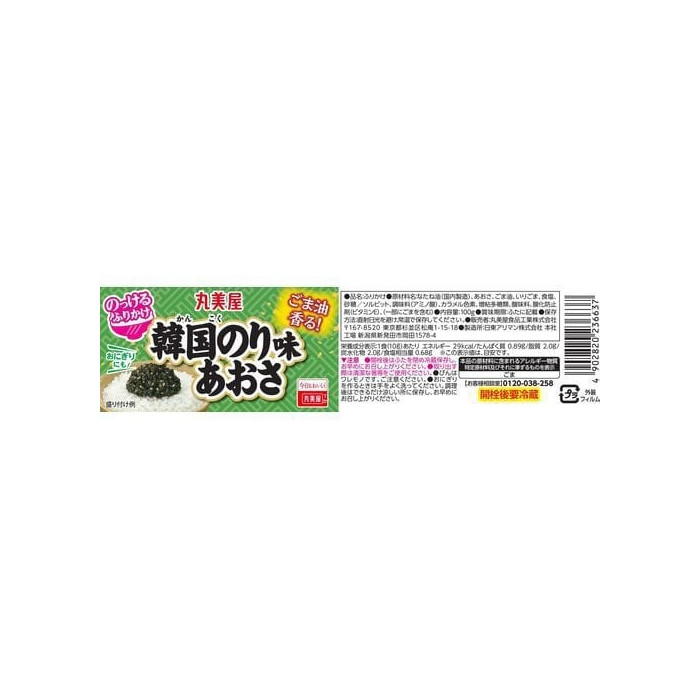 • 사용 후에는 반드시 뚜껑을 단단히 닫아 보관하십시오.성분 / 분량 김, 아오사(파래), 식물성유지, 참기름, 간장, 설탕, 식염, 발효조미료, 효모추출물, 조미료(아미노산 등) 등