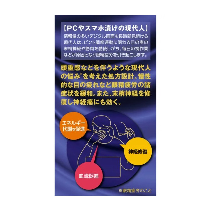 비타민 B군을 중심으로 한 복합 성분이 함유되어 있어 눈의 신진대사를 촉진하고 눈 조직의 기능을 정상적으로 유지하는 데 도움을 줍니다. 또한 눈의 피로, 시야 흐림, 눈의 충혈 및 건조감 등 일상에서 발생하기 쉬운 눈 관련 증상을 완화하는 데 도움을 줄 수 있습니다.