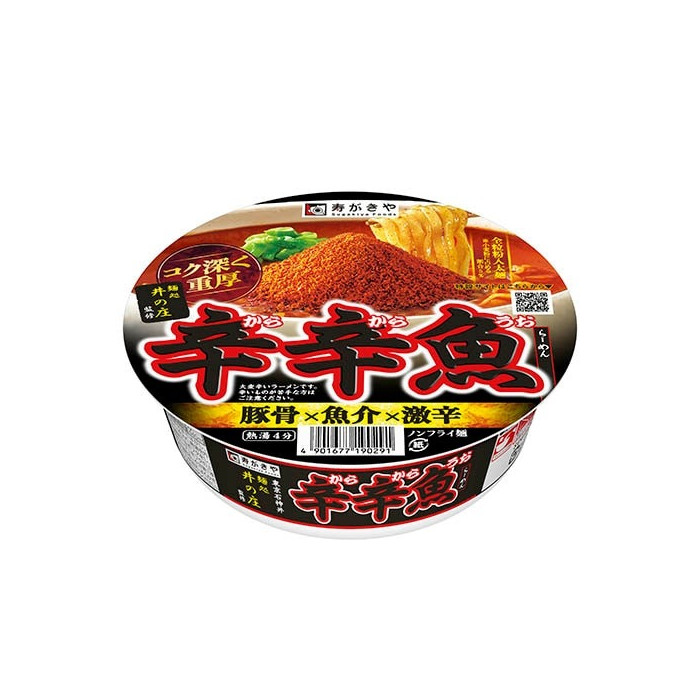 상품 정보 (일본 프리미엄 매운 컵라면) 스가키야 멘도코로 이노쇼 감수 카라카라우오 라면은 일본 라멘 매니아들 사이에서 '격하게 맵지만 중독성 있는 맛'으로 정평이 난 제품입니다. 돼지 사골 베이스의 걸쭉한 돈코츠 수프에 고추와 생선 가루를 듬뿍 섞은 특제 '카라카라 가루'를 더해 깊은 풍미를 완성했습니다. 특히 면은 통밀(전립분)을 배합한 논프라이(Non-fry) 굵은 면을 사용하여 전문점 수준의 쫄깃한 식감을 자랑합니다. 제품 사양 상품명 카라카라우오 라면 (辛辛魚らーめん) 맛의 특징 진한 돈코츠 소유(간장) + 생선 가루 + 강력한 매운맛 내용량 136g (면 75g) 면 종류 논프라이(Non-fry) 굵은 면 (전립분 배합) 제조사 스가키야 식품 (Sugakiya Foods) 조리 방법 및 구성 - **수프 구성:** 액체 수프, 분말 수프, 그리고 마지막에 뿌려 먹는 산더미 같은 '특제 카라교분(매운 생선 가루)'이 들어있습니다.
